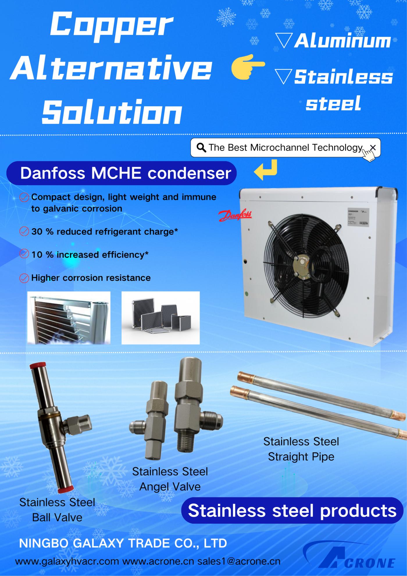 So you will find that we offer valves & pipes in Stainless Steel, and Aluminum made condenser from Danfoss compared with traditional Copper items, designed in high-efficiency, costless, environment-friendly, duable long service life.